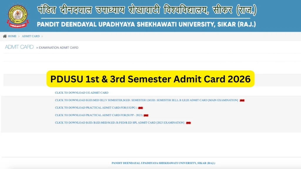 PDUSU 1st & 3rd Semester Admit Card 2026 Released-Download UG Exam Hall Ticket.Pandit Deendayal Upadhyaya Shekhawati University (PDUSU), Sikar has officially released the PDUSU 1st and 3rd Semester Admit Card…